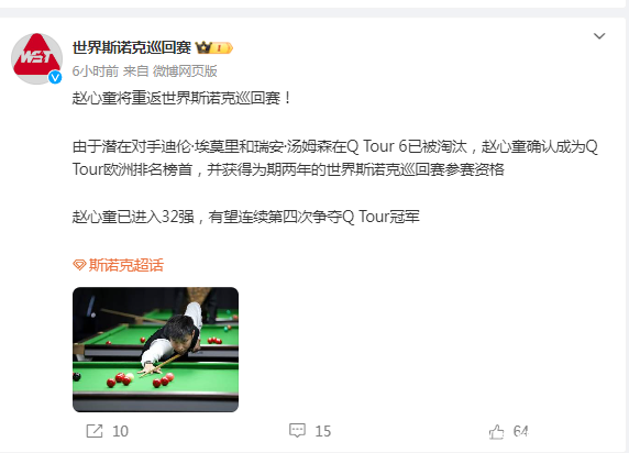 来到Q-Tour第六站正赛第一轮,赵心童以4-0横扫阿苏托什-帕迪。此役过后,赵心童正式回归职业赛。世界斯诺克巡回赛官微写道:“赵心童将重返世界斯诺克巡回赛!由于潜在对手迪伦·埃莫里和瑞安·汤姆森在Q Tour 6已被淘汰,赵心童……获得为期两年的世界斯诺克巡回赛参赛资格……”。