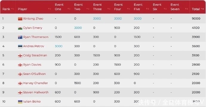前职业赛球员迪伦-埃莫里以4100分排在第二名、澳大利亚选手瑞安-汤姆森以3900分排在第三位,赵心童对他们的领先优势在两倍以上。